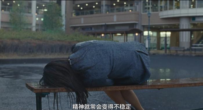 自影片伊始,映入观众眼帘的便是一场对“雨”的特写——雨水敲打着水泥路砖的缝隙,淋湿了掉在地上的单肩包。接着,在密织的雨景之中,我们看到本片的主角藤泽蜷缩在公交站台的长椅上,她的身体已被雨水浸透,但她显然无力避雨。