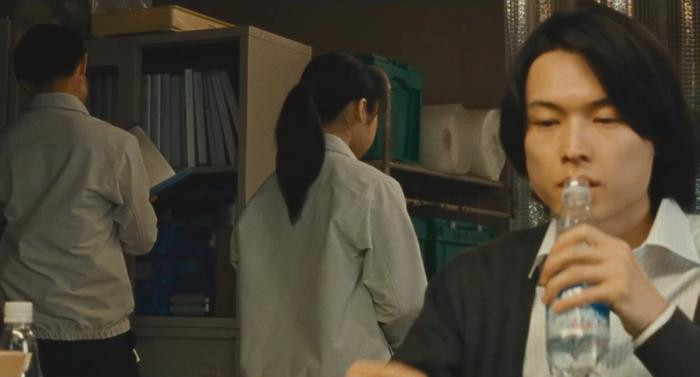 接下来的两场戏更强化了我们对于山添的最初印象。山添在待人接物上总是一副漫不经心的态度,与之相反的是,他对于三得利气泡水却始终怀有一种莫名其妙的痴恋。山添的工位上摆放着至少两瓶气泡水,每当山添出现在画面之中的时候,他也总是在喝气泡水。而正是山添拧开汽水瓶盖的声音,成为了诱发藤泽情绪失控的导火索。最终,这一段落在一场鸡飞狗跳的争吵之中收场。